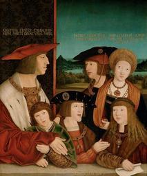 Keywords: Bernhard Strigel 003b.jpg Artwork Q1777935 Creator Bernhard Strigel langswitch Kaiser Maximilian I mit seinem Sohn Philipp dem Schönen seiner Gattin Maria von Burgund seinen Enkeln Ferdinand I Karl V und seinem Schwiegerenkel Ludwig II Emperor Maximilian I with his son Philip the Fair his wife Mary of Burgundy his grandsons Ferdinand I and Charles V and Louis II of Hungary husband of his granddaughter Mary of Austria > 1515 oil lime cm 72 8 60 4 Institution Kunsthistorisches Museum object history de Wahrscheinlich anläßlich der Doppelverlobung der Enkel Maximilians 1515 in Wien gemalt; 1520 im Besitz des kaiserlichen Historiographen Johannes Cuspinian der die Darstellung zur heiligen Sippe uminterpretierte indem er von Strigel selbst die Rückseite der Tafel GG 6411 bemalen und durch Hinzufügung eines rechten Flügels mit einem Familienbildnis Cuspinians als dritten Zweig der hl Sippe heute Privatbesitz zum Diptychon ergänzen ließ; In den 90er Jahren des 16 Jahrhunderts in der kaiserlichen Porträtsammlung in Wien nachweisbar de Beschriftung Die Inschrift später hinzugefügt über Maximilian CLEOPHAS FRATER CARNALIS IO/SEPHI MARITI DIVAE VIRG MARIAE; über Philipp dem Schönen I/IACOBVS MINOR EPVS /HIEROSOLIMITANVS; über Maria von Burgund MARIA CLEOPHAE SOROR/VIRG MARPVTATIVA MA/TER TERA D N über Ferdinand III/IOSEPH IVSTVS unter Karl II/SIMON ZELOTES CONSO/BRINVS DNI NRI accession number GG_832 http //bilddatenbank khm at/viewArtefact id 1849 other versions <gallery> Bernhard Strigel 003 jpg Bernhard Strigel - Emperor Maximilian I with His Family - Google Art Project jpg -Strigel-Antoniter-Museum05-2 JPG version Antoniter Museum Memmingen Strigel-Antoniter-Museum05 JPG version Antoniter Museum Memmingen </gallery> PD-old-100 DEFAULTSORT Strigel Maximilian and his family 1515 circa; Bernhard Strigel Paintings by Bernhard Strigel with fur Paintings by Bernhard Strigel in the Kunsthistorisches Museum Collar of the Order of the Golden Fleece in portrait paintings Family portraits of Holy Roman Empire rulers Louis II of Hungary Male portrait paintings with ermine clothing Male portrait paintings with fur clothing Males with jewels on cap Mary of Burgundy Paintings of children's clothingMedia Portrait paintings of Ferdinand I Holy Roman Emperor Portraits of Maximilian I Holy Roman Emperor Portraits of young Charles V Holy Roman Emperor Philip I of Castile in portrait paintings Berets in art Children's clothing Portrait paintings with ermine clothing Fur garments in art Group portraits with 6 persons Marten clothing in art Pageboy haircut Portraits with Latin captions Portraits with ornamental background Portraits with parapet Portraits with window at the background 16th-century family portraits of royalty 16th-century oil on panel paintings in Austria 16th-century oil portraits at half length 16th-century paintings not categorised by year 16th-century portrait paintings 16th-century portrait paintings in the Kunsthistorisches Museum Fur fashion in 1516 ImageNote 1 116 198 106 123 600 722 2 Maximilian I ImageNoteEnd 1 ImageNote 2 329 233 82 90 600 722 2 Philip the Fair ImageNoteEnd 2 ImageNote 3 459 248 84 83 600 722 2 Mary of Burgundy ImageNoteEnd 3 ImageNote 4 119 435 95 88 600 722 2 Ferdinand I ImageNoteEnd 4 ImageNote 5 276 416 80 89 600 722 2 Charles V ImageNoteEnd 5 ImageNote 6 447 423 82 92 600 722 2 Louis II of Hungary ImageNoteEnd 6 ImageNote 7 7 111 217 41 600 722 2 CLEOPHAS FRATER CARNALIS IO / SEPHI MARITI DIVAE VIRG MARIAE ImageNoteEnd 7 ImageNote 8 290 130 151 45 600 722 2 I/IACOBVS MINOR EPVS /HIEROSOLIMITANVS ImageNoteEnd 8 ImageNote 9 441 133 158 52 600 722 2 MARIA CLEOPHAE SOROR/VIRG MARPVTATIVA MA/TER TERA D N ImageNoteEnd 9 ImageNote 10 125 668 135 47 600 722 2 III/IOSEPH IVSTVS ImageNoteEnd 10 ImageNote 11 261 673 193 48 600 722 2 II/SIMON ZELOTES CONSO/BRINVS DNI NRI ImageNoteEnd 11 |