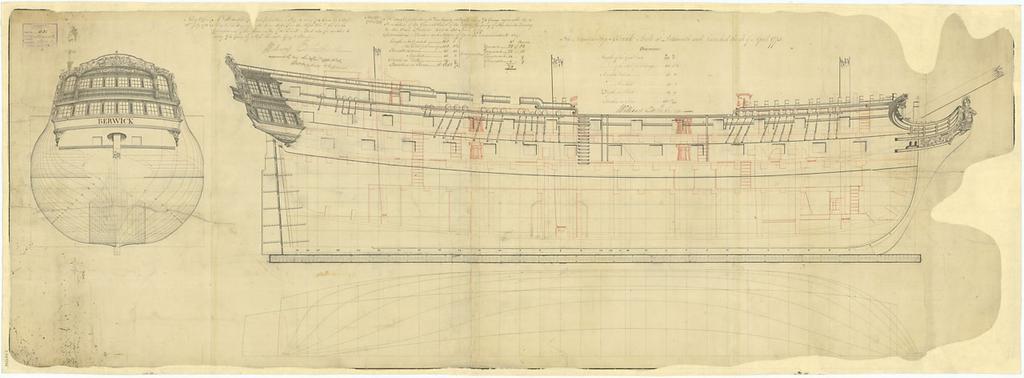 Keywords: Berwick BombayCastle Powerful Defiance.jpg Plan showing the body plan with sternboard decoration and name on the counter sheer lines with inboard detail and figurehead and longitudinal half-breadth for Berwick 1775 a 74-gun Third Rate two-decker as built at Portsmouth Dockyard The plan was later approved for Bombay Castle 1782 Powerful 1783 and Defiance 1783 of the same class Signed by John Williams Surveyor of the Navy 1765-1784 and Edward Hunt 1778-1784 http //collections rmg co uk/collections/objects/80616 html NMM ZAZ0825 1775 author PD-old-100 Ships of the line of the Royal Navy Lines plan PD-old-100