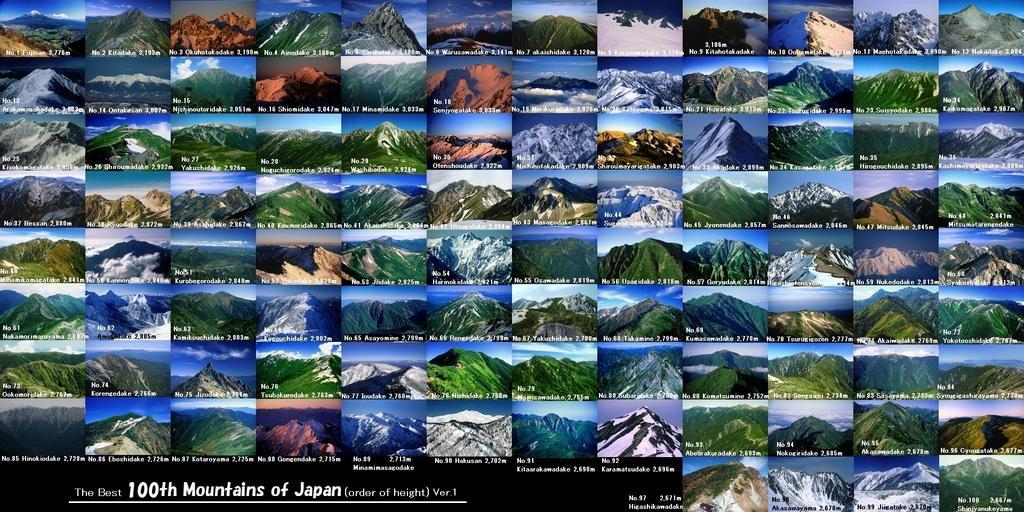 | Keywords: Best100th mountains of Japan order of hight.jpg Montage of the 100 highest mountains in Japan listed by elevation 日 の山を標高順に100位まで並べた画像 own Mount Fuji 富士山 File Fujisan from kenashiyama 01 1994 11 27 jpg Mount Kita 北岳 File Mount Kita from Mount Nakashirane 2001-10-03 JPG Mount Okuhotaka 奥穂高岳 File Maehodakake and Okuhotakadake from cho 03 2001 11 23 jpg Mount Ai 間ノ岳 File Mount Aino fom Mount Kita 2001-7-2 jpg Mount Yari 槍ヶ岳 File 05 Yarigatake from Higashikamaone 2000-8-16 jpg Mount Warusawa 悪沢岳 File Mount Arakawa from Mount Ogochi 1999-11-05 jpg Mount Akaishi 赤石岳 File Akaishidake from senmaidake 07 1994 7 31 jpg Mount Karasawa 涸沢岳 File Karasawdake from Karasawa 1999-5-23 jpg Mount Kitahotaka 穂高岳 File Mount Kitahotaka from Mount Minami jpg Mount Obami 大喰岳 File Mount Obami from Mount Yari Hut jpg Mount Maehotaka 前穂高岳 File Hotakadake from Tokugotoge 1994-4-30 jpg Alpsdake 2010-06-20 Mountains of Japan Montages of mountains |