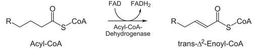 Keywords: Beta-Oxidation1.svg 1 Teilreaktion der Beta-Oxidation 1st step of beta oxidation own 2007-01-07 NEUROtiker Lipid metabolism Enzyme reactions