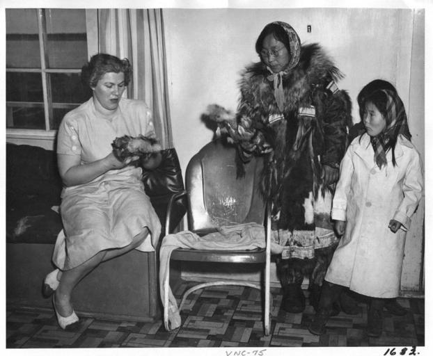 Keywords: Bethel doll sellers FWS.jpg en Bethel Family Selling Dolls Yup'ik Eskimo woman and child with their fur dolls which they offer for sale at the Bethel Roadhouse The mother is in traditional clothing Both are wearing traditional scarves but the girl's coat is of modern style for the period There appears to be a second child behind the girl not mentioned in the FWS caption FWS keywords Villages Wildlife refuges Yukon Delta National Wildlife Refuge YUDE Native Americans Crafts Sewing ARLIS Alaska U S Fish and Wildlife Service The Pribilof Report 1949 Source FWS-1683 Public domain US Fish and Wildlife Service National Digital Library http //www fws gov/digitalmedia/cdm4/item_viewer php CISOROOT /natdiglib CISOPTR 3831 CISOBOX 1 REC 2 Haddon E P 1949-09-01 Consent published PD-USGov Bethel Alaska Yupik 1949 in Alaska History of tourism in Alaska Fur clothing of Inuit people Fur figures Dolls Photographs taken on 1949-09-01 Yukon Delta National Wildlife Refuge Fur fashion in 1949 |