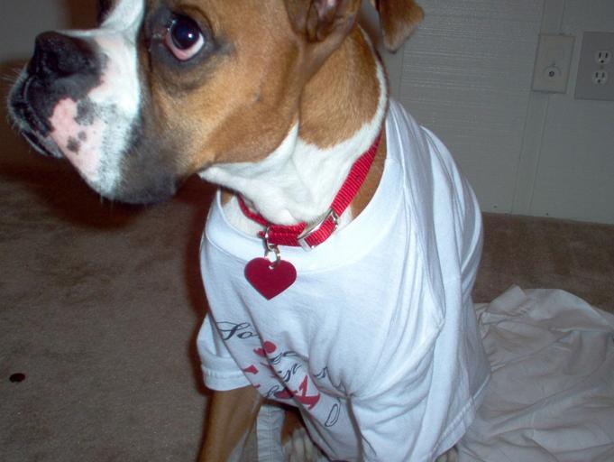 Keywords: Betty 018.jpg Betty a 2 year old flashy fawn boxer brought from the SPCA of Houston 2006-09-05 own assumed Peneloppe ugarte~commonswiki Boxer dog Heart shaped dog tags Dogs wearing T-shirts Fawn dogs Low quality images of dogs