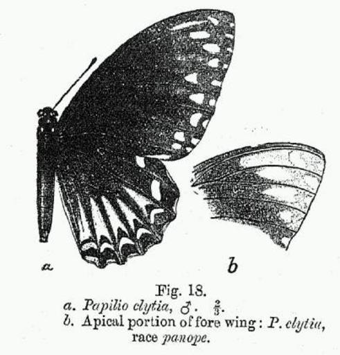 Keywords: BH034 Papilio clytia.jpg Male Papilio clytia <small>Linnaeus 1758</small> <br/> a P c clytia upperside<br/> b P c panope <small>Linnaeus 1758</small> upper forewing tip<br/> Common Mime Fauna of British India - Butterflies Vol 1 2 Original work 1905-1907 Uploaded 16 31 4 May 2006 UTC by Nature Loader C T Bingham PD-old Papilio clytia Bingham's Fauna of British India Butterflies Papilio wings |