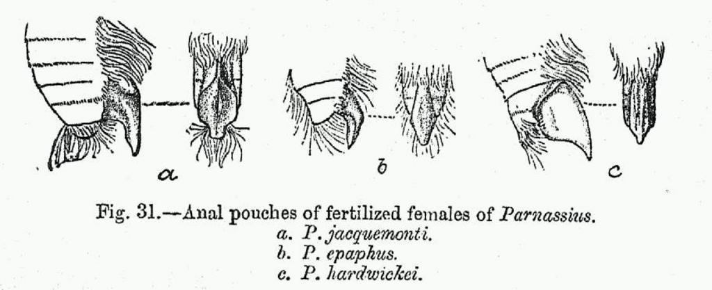 Keywords: BH043 Parnassius 3 spp female anal pouches.jpg Parnassius female anal pouches after fertilization left from the side right from ventral <br /> a Parnassius jacquemonti <small>Boisduval 1836</small><br /> b Parnassius epaphus <small>Oberthür 1879</small><br /> c Parnassius hardwickei Parnassius hardwickii <small>Gray 1831</small><br /> Apollos Fauna of British India - Butterflies Vol 1 2 Original work 1905-1907 Uploaded 17 05 4 May 2006 UTC by Nature Loader C T Bingham PD-old Bingham's Fauna of British India Butterflies Papilionidae genitalia Parnassius Parnassius jacquemontii Parnassius epaphus Parnassius hardwickii |