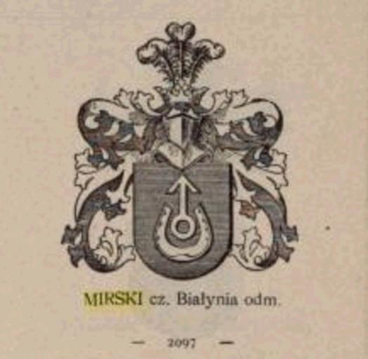 Keywords: Bialynia Mirski.PNG This is the Bialynia coat of Arms used by the Mirski family PD-old Coats of arms of families of Poland Herb Swiatopelk-Mirskich Ostrich feathers in crest Bialyna Mirski Polish nobleman crown and helmet Bialyna Mirski Rune and Tamgha like symbols in heraldry Bialyna Mirski Horseshoes in heraldry Bialyna Mirski |