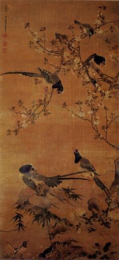 | Keywords: Bian Jingzhao-Birds Flocking at Flowers and Bamboo.jpg en Birds Flocking at Flowers and Bamboo hanging scroll Color on silk 137 7 x 65 5 cm Located at the Shanghai Museum An alternate name is Spring Birds and Flowering Trees zh 花竹聚禽 - 立軸 - 絹 設色 纵137 7厘米 横65 5厘米 上海博物院藏 亦名 春禽花 Zhongguo gu dai shu hua jian ding zu 中国古代书画鑑定组 2000 Zhongguo hui hua quan ji 中国绘画全集 Zhongguo mei shu fen lei quan ji Beijing Wen wu chu ban she Volume 10 Creator Bian Jingzhao Early Ming Dynasty 1368 1644 PD-old-100 ImageNote 1 32 29 40 252 985 2155 2 武英殿 待詔隴西邊景昭寫 ImageNoteEnd 1 Bian Jingzhao Paintings of the Ming Dynasty Paintings in the Shanghai Museum Bird-and-flower paintings of China |