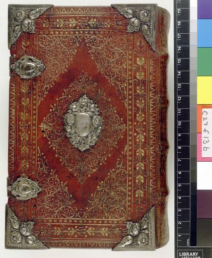 Keywords: Biblia ... Deutsch, D. Martini Lutheri, mit ausgehenden Versiculn, kurtzen Summarien ... &c - Lower cover (c27f13).jpg Style Pointille comprising dots ; Caption Lower cover; Colour Red; Edge Gilt and gauffered exhibition history Decorative Technique Tooled in gold; Cover Material Goatskin includes morocco turkey etc Gold tooled with silver corner pieces and silver centrepieces with on the upper cover the letters SDM and on the lower cover the date Ao 1695 2 pairs fo clasps object history Text 1683; Luneburg; Unspecified object type Cc-zero place of creation Binding Germany place of discovery Unspecified British Library image http //www bl uk/catalogues/bookbindings/LargeImage aspx RecordId 020-000008430 ImageId ImageId 43820 Copyright BL Biblia Deutsch D Martini Lutheri mit ausgehenden Versiculn kurtzen Summarien c Uploaded with GWToolset Biblia Deutsch D Martini Lutheri mit ausgehenden Versiculn kurtzen Summarien c - Lower cover c27f13 http //www webarchive org uk/bldatasets/bindings/9050_4 jpg Bookbinding 17th-century bookbinding British Library Bookbindings |