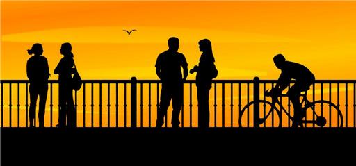 Keywords: bicycle bike bridge female male men people silhouettes sunset women