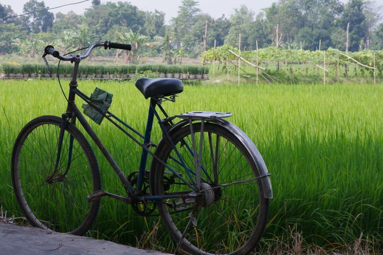 Keywords: bicycles bike vehicles greenery grasses paddy fields leaves leafy plants rice crops parking parked lands grounds outdoors nature farms farming bright day
