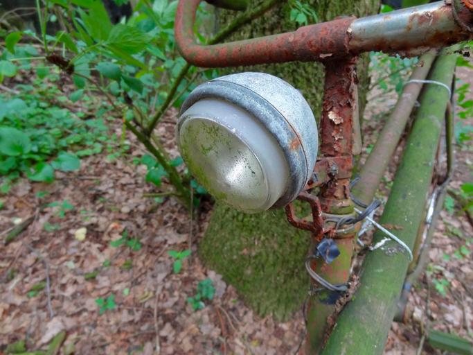Keywords: bike forest old stainless ancient bicycle lamp lamp chained time past verdigris moss dirt