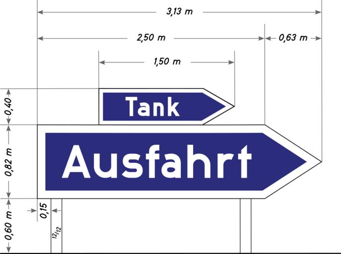 | Keywords: Bild 3 - Ausfahrt mit Zusatzschild Tank, RAB T1 Jwkb 286, 1939.svg de Bild 3 Pfeilschild žAusfahrt mit Zusatzschild žTank nach der Anlage zur technischen Vorschrift Reichsautobahn T-1 Jwkb 286 vom 12 August 1939 Dort wird das Schild als žBild 3 bezeichnet Die Originalbemaßung aus der in der Vorschrift abgebildeten Skizze wird hier vollständig wiedergegeben Nähere Maßangaben zur Breite der weißen Umrandung oder zur Schriftgröße werden nicht gemacht Der Blauton entstammte der RAL-Farbkarte 840 b2 und war 32 h Nach dem Krieg galten die Reichsautobahn-Vorkriegsbestimmungen noch einige Zeit als Bundesgesetz weiter Vorschrift Reichsautobahn T-1 Jwkb 286 vom 12 August 1939 gezeichnet und interpretiert durch Mediatus Mediatus 2015-08-24 other fields + Signs User Mediatus/no-new-version Cc-zero PD-Vz historisch SVG road signs in Germany German language signs Diagrams of motorway road signs of Germany 1939 set Reichsautobahn signs Blue and white signs |