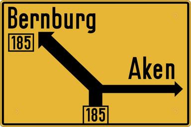 Keywords: Bild 54 f - Vorwegweiser zu Straßenkreuzungen und Abzweigungen, StVO DDR 1964.svg de Bild 54 f Vorwegweiser zu Straßenkreuzungen und Abzweigungen StVO DDR 1964 Verkehrszeichen der Deutschen Demokratischen Republik nach der Straßenverkehrsordnung StVO von 1964 <br /> Die Ausführung dieses Schildes richtet sich nach den im April 1967 bekanntgegebenen Normen TGL 10629 Blatt 2 Leiteinrichtungen für den Straßenverkehr “ Verkehrszeichen “ Schilder und TGL 10629 Blatt 3 Leiteinrichtungen für den Straßenverkehr “ Verkehrszeichen “ Symbole Farbe Schrift Die Farbgrenzen werden deffiniert nach der im Februar 1967 bekanntgegebenen Norm TGL 20684 Blatt 6 Signallichter “ Farben und Farbgrenzen im Verkehrs “ Ortsfeste Signallichter im Straßenverkehr Alle zwei genannten Normen wurden am 01 01 1968 verbindlich TGL 20684 Blatt 6 war ein Ersatz für die ältere Norm TGL 06163 vom November 1962 die bei Einführung der StVO von 1964 galt Damals hatte es noch keine durch die CIE-Normfarbtafel festgelegten Farbgrenzen gegeben Die normierten Bohrlöcher im Schild nach TGL 10629 Tabelle 2 sind behördlich vorgeschrieben und daher unverzichtbarer Bestandteil bei diesen Verkehrszeichen und werden somit in der Abbildung wiedergegeben Anwendung fand bei der Einführung dieser StVO noch die Typfarbkarte 5/62 und ab dem 01 10 1969 die verbindlich eingeführte Farbkarte nach TGL 21196 TGL 21196 vom Januar 1969 Anstrichstoffe “ Farbregister Typfarbkarte 5/62 Rot 3000 RAL-Farbtonregister 840 R 3000 TGL 21196 1969 0605 žSignalrot Lab L 44 78 a 50 80 b 26 62 Zur CIELab-Umwandlung siehe TGL 21196 Juni 1987 Anstrichstoffe “ Farbregister “ Vorzugsfarben own Mediatus 03 März 2016 Herstellungsdatum other fields + Signs User Mediatus/no-new-version Cc-zero PD-Vz historisch SVG road signs in East Germany 54f svg Diagrams of direction road signs of East Germany 1964 set 54f svg