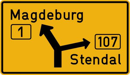 | Keywords: Bild 54 a - Vorwegweiser vor Straßenkreuzungen und -abzweigungen, StVO DDR 1971.svg de Bild 54 a Vorwegweiser vor Straßenkreuzungen und -abzweigungen StVO DDR 1971 Verkehrszeichen der Deutschen Demokratischen Republik nach der Novelle der Straßenverkehrsordnung StVO von 1971 <br /> Die Ausführung dieses Schildes richtet sich nach den im April 1967 bekanntgegebenen Normen TGL 10629 Blatt 2 Leiteinrichtungen für den Straßenverkehr “ Verkehrszeichen “ Schilder und TGL 10629 Blatt 3 Leiteinrichtungen für den Straßenverkehr “ Verkehrszeichen “ Symbole Farbe Schrift Die Farbgrenzen werden deffiniert nach der im Februar 1967 bekanntgegebenen Norm TGL 20684 Blatt 6 Signallichter “ Farben und Farbgrenzen im Verkehrs “ Ortsfeste Signallichter im Straßenverkehr Alle zwei genannten Normen wurden am 01 01 1968 verbindlich TGL 20684 Blatt 6 war ein Ersatz für die ältere Norm TGL 06163 vom November 1962 die bei Einführung der StVO von 1964 galt Damals hatte es noch keine durch die CIE-Normfarbtafel festgelegten Farbgrenzen gegeben Die normierten Bohrlöcher im Schild nach TGL 10629 Tabelle 2 sind behördlich vorgeschrieben und daher unverzichtbarer Bestandteil bei diesen Verkehrszeichen und werden somit in der Abbildung wiedergegeben Anwendung fand bei der Einführung dieser StVO noch die Typfarbkarte 5/62 und ab dem 01 10 1969 die verbindlich eingeführte Farbkarte nach TGL 21196 TGL 21196 vom Januar 1969 Anstrichstoffe “ Farbregister Die hier wiedergegebenen Farben richten sich nach den TGL-Vorgaben für Verkehrszeichen Hier TGL 0209 Chromgelb Berechnung aus dem xyY-Farbraum EEB110 own Mediatus 06 März 2016 Herstellungsdatum other fields + Signs User Mediatus/no-new-version Cc-zero PD-Vz historisch SVG road signs in East Germany 54a svg Diagrams of direction road signs of East Germany 1971 set 54a svg |