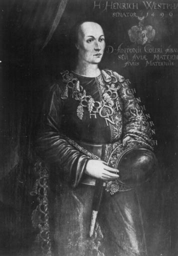 Keywords: Bildnis des Lübecker Ratsherrn Heinrich Westfal (1496).jpg <s>Bildnis des Dr Anton Köhler 1542-1657 Als Bürgermeister in den Rat gewählt 1642 jpg</s> Der Lübecker Ratsherr Heinrich Westval im mittelalterlichen Schellenkostüm Bildnis um 1640 nach einer älteren Vorlage http //www bildindex de/ 1700 author PD-Art-100 Köhlersche Ahnengalerie 15th-century senators of Lübeck 16th-century senators of Lübeck 1505 deaths |