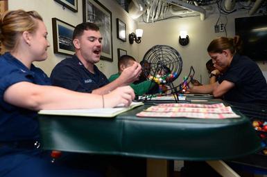 Keywords: Bingo night 141022-N-GW918-016.jpg en Cryptologic Technician-Technical 2nd Class Kees Sharp calls numbers in a Morale Welfare and Recreation MWR sponsored Bingo night aboard the Ticonderoga-class guided-missile cruiser USS Bunker Hill CG 52 Bunker Hill is deployed as part of the Carl Vinson Carrier Strike Group supporting maritime security operations strike operations in Iraq and Syria as directed and theater security cooperation efforts in the U S 5th Fleet area of responsibility U S Navy photo by Mass Communication Specialist 1st Class LaTunya Howard/Released 2014-10-22 Petty Officer 2nd Class LaTunya Turner Howard https //www dvidshub net/image/1651214 141022-N-GW918-016 2014-11-10 19 37 USS BUNKER HILL AT SEA PD-USGov-Military-Navy USS Bunker Hill CG-52 Images from DoD uploaded by Fæ |