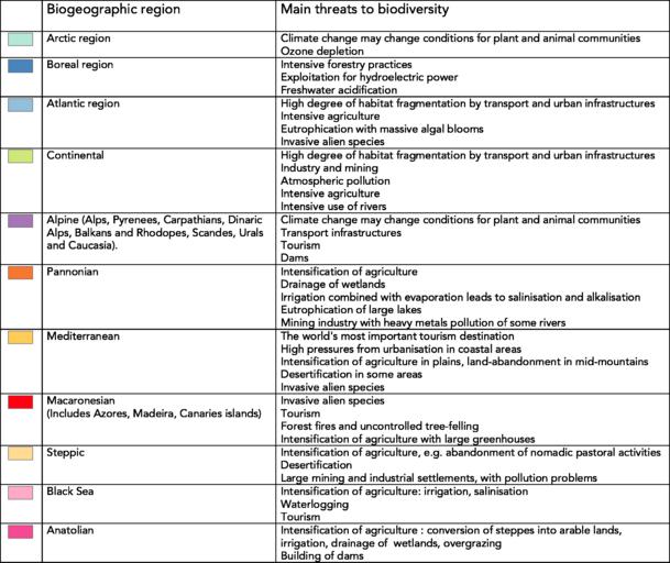 Keywords: Biogeographical Regions Europe - Legend (en).png PD-EEA English version Source Full references in European Environment Agency Europe's environment the third assessment Environmental assessment report No 10 Luxembourg Office for Official Publications of the European Communities p 231 Date 05/2003 Relations http //reports eea eu int/environmental_assessment_report_2003_10/en http //dataservice eea eu int/dataservice/metadetails asp id 308 Type Map Version 5 Technical producer European Environment Agency http //www eea eu int Original data used to produce the analysis Biogeographical regions Europe 2001 The bio-geographic regions dataset contains the official delineations used in the Habitats Directive 92/43/EEC and for the EMERALD Network set up under the Convention on the Conservation of European Wildlife and Natural Habitats Bern Convention Published in the following report s Europe's environment the third assessment This is the third pan-European state of the environment report produced by the EEA It was prepared for the 'Environment for Europe' Ministerial Conference being held under the auspices of the UN Economic Commission for Europe in Kiev Ukraine on 21-23 May 2003 This assessment is the most comprehensive up-to-date overview currently available of the state of the environment on this continent In contrast to previous reports issued in 1995 and 1998 it covers for the first time the entire Russian Federation and the 11 other Eastern European Caucasus and Central Asian EECCA states The report also analyses how the main economic driving forces put pressure on the European environment and identifies key areas where further action is needed Owner en European Environment Agency Biogeographical maps of Europe Map legends |