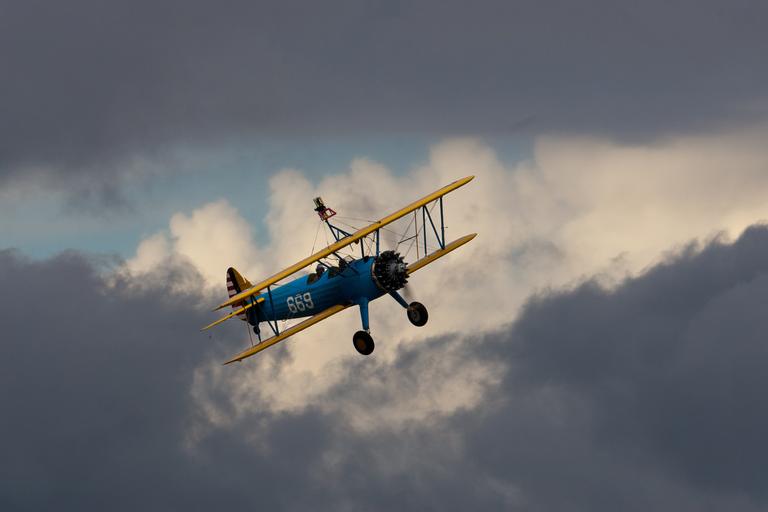 Keywords: biplane flying propeller oldtimer heavy cloud