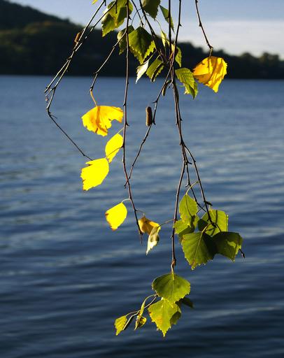 Keywords: birch foliage twigs summer green yellow tree plant nature figure water lake beach hanging leaflet poland malopolska czorsztyn flaccid thin delicate peace of mind sunny sunset