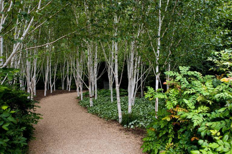 MAKE A MEME View Large Image birch trees white barked grouped mahonia in foreground pulmonaria gravel path angelsey abbey cambridgeshire