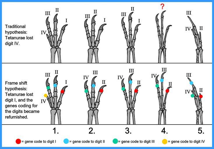 | Keywords: Bird and dino hand difference debate.JPG en Diagram made to illustrate the debate over the hands of theropod dinosaurs and their alleged descendants the birds Aves In the last years the difference between the hands of theropods and birds have been an important thing when it comes question the theory that birds evolved from dinosaurs even though some scientists may could refute it In the diagram a Neotheropoda 1 basal tetanurae 2 a coelurosaurian 3 the bird Archaeopteryx 4 and modern bird 5 In 1997 birdexpert Alan Feduccia at University of North Carolina discovered that birds develop hands with the digits II III and IV see The Cincinnati Enquirer 25 - 10 - 1997 This is in contrast with the hands of tetanurae which seems to have the digits I II and III This make it almost impossible for dinosaurs and birds to be closely related according to Feduccia Since the discovery by Feduccia scientific research have came up with a possible explanation to the mystery of the dinosaur - bird hand difference called The frame shift hypothesis see http //scienceblogs com/tetrapodzoology/2009/06/limusaurus_is_awesome php This hypothesis is based on a discovery which shows that although bird embryos develop the fingers II III and IV the genes which is coding for the external appearance of the digits seems to be from the fingers I II and III Based on this scientists belive this when neotheropods evolved into tetanurae the losed digit I not digit IV as earlier suggested During this process the genes which coded for how the digits should looks like the number of phalanges for example became refurnished see the color spots in th upper section in the diagram to understan The discovery of Limusaurus has been said to support this theory see http //www livescience com/animals/090617-dinosaur-hands html One thing is that may can be used to refute that Limusaurus should support the Frame shift hypothesis is that Limusaurus was a ceratosaurian and is dated to be much younger than the oldest tetanurae's Also some tetanure“s may had 4 digits' like the Archaeornithomimus see number 4 in the diagram see also http //dml cmnh org/1998Oct/msg00443 html and the Allosaurus hand in the image here http //upload wikimedia org/wikipedia/commons/6/69/Allosaurus-mounted jpg If this is the digits I II III and IV If so it shows that tetanurae had the digits I II and III and not II II and IV like birds For more in this debate see text section to my picture Raptor-Archaeopteryx-bird hands differens JPG at http //commons wikimedia org/wiki/File Raptor-Archaeopteryx-bird_hands_differens JPG own Conty Archosauria Bird wing bones Reptilia limb bones Animal limb bone comparisons |