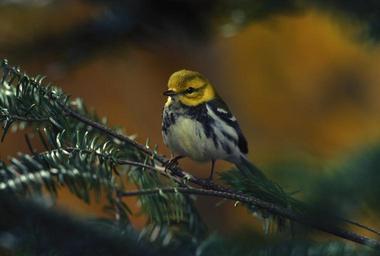 Keywords: bird warbler female black throated green wildlife nature perched songbird colorful tree
