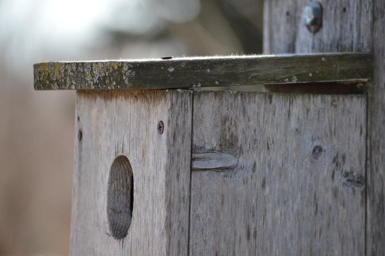 Keywords: birdhouse wooden old bird box home nest empty outdoor nesting spring wood texture worn roof