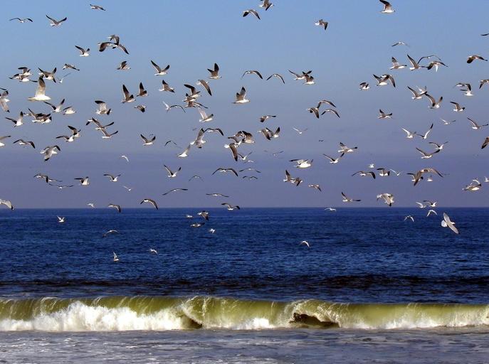 Keywords: birds seagulls flying ocean water sky soar soaring gull freedom flock flight sea graceful majestic animals jersey shore