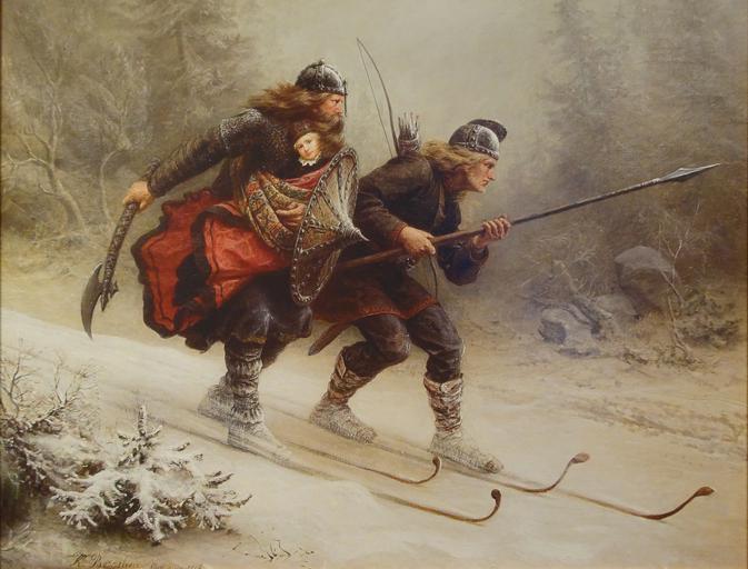 | Keywords: Birkebeinerne på Ski over Fjeldet med Kongsbarnet (cropped).jpg Artwork creator Knud Bergslien en Depiction of Birkebeiner skiers carrying Prince Haakon to safety during the winter of 1206 has become a national Norwegian icon The prince grew up to be King Haakon IV whose reign marked the end of the period known as the Civil war era in Norway foto© O Væring Eftf AS Oslo/Norway www ovaering no 1869 The Ski Museum Holmenkollen Oslo Birkebeinerne på Ski over Fjeldet med Kongsbarnet The Ski Museum Holmenkollen Oslo Norway The copyright has definitely expired in the Norway Painters death + 70 years <gallery> File Birkebeinerne ski01 jpg File Birkebeinerne ski jpg </gallery> PD-Art PD-old-auto-1923 1908 Norway Birkebeinerne på Ski over Fjeldet med Kongsbarnet jpg Uploaded with UploadWizard Paintings by Knud Bergslien Haakon IV of Norway Skimuseet Skiing in Norway in art |