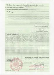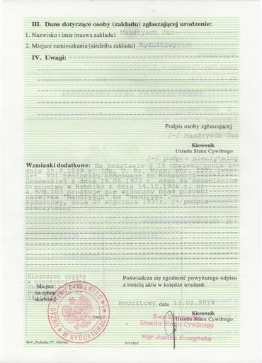 Keywords: Birth certificate with changed name.jpg en Second page of birth certificate with lawlessly changed name by polish governament in 1937 year pl Druga strona odpisu zupełnego aktu urodzenia ze spolszczonym przez polski aparat państwowy nazwiskiem w 1937 roku delivered by polish civil registry scane made by me 2014-02-15 PD-Polishsymbol Documents Cc-zero |