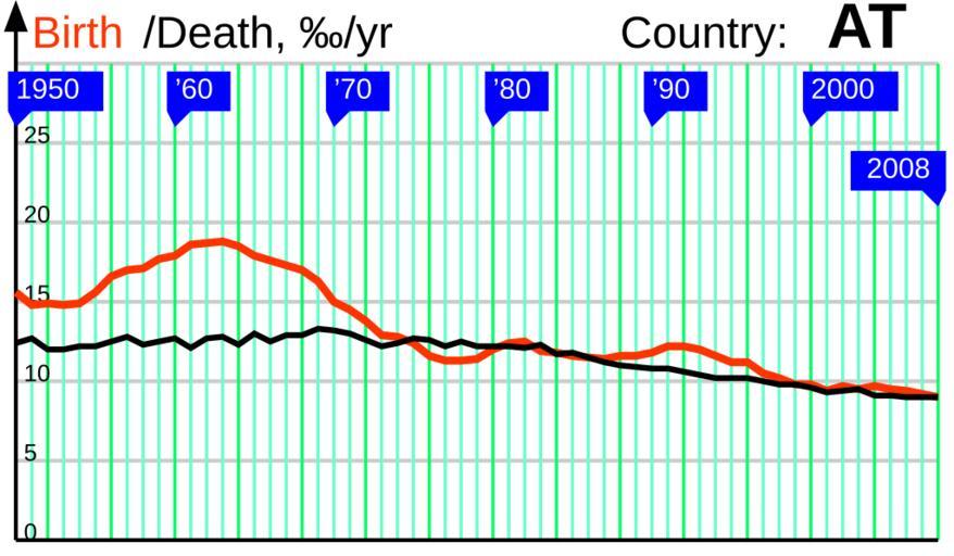 | Keywords: BirthDeath 1950 AT.svg en The birth and death rates in Austria 1950 2008 ru Рождаемость и сме тность в Авст ии 1950 2008 own Incnis Mrsi 2009-07-14 public domain File RNI 1950 AT svg Disclaimer The author of this graph gives no warranty and accepts no responsibility for its factual accuracy This graph is nothing but a visualization of data from http //demoscope ru/weekly/ias/ias05 php tim 0 cou 2 terr 1 ind 26 Submit OK http //demoscope ru/weekly/ias/ias05 php tim 0 cou 2 terr 1 ind 1 Submit OK which may be incomplete or error-prone If you find an error please correct the data in a <path d /> tag adding some comments about your reliable source and upload the file over Demographic charts of Austria Birth and death rates |