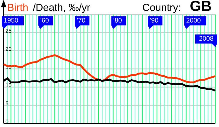 Keywords: BirthDeath 1950 GB.svg en The birth and death rates in the United Kingdom of Great Britain and Northern Ireland 1950 2008 ru Π ΠΎΠΆΠ΄Π°Π΅ΠΌΠΎΡΡΡ ΠΈ ΡΠΌΠ΅Ρ ΡΠ½ΠΎΡΡΡ Π² ΠΠ΅Π»ΠΈΠΊΠΎΠ±Ρ ΠΈΡΠ°Π½ΠΈΠΈ Π³ΠΎΡΡΠ΄Π°Ρ ΡΡΠ²Π΅ 1950 2008 own Incnis Mrsi 2009-07-13 public domain File RNI 1950 GB svg Disclaimer The author of this graph gives no warranty and accepts no responsibility for its factual accuracy This graph is nothing but a visualization of data from http //demoscope ru/weekly/ias/ias05 php tim 0 cou 7 terr 1 ind 26 Submit OK http //demoscope ru/weekly/ias/ias05 php tim 0 cou 7 terr 1 ind 1 Submit OK which may be incomplete or error-prone If you find an error please correct the data in a <path d ¦ /> tag adding some comments about your reliable source and upload the file over Demographic charts of the United Kingdom Birth and death rates |