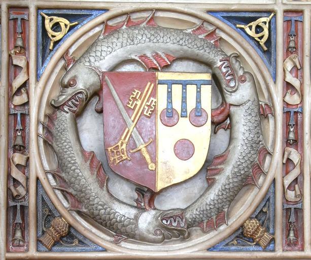 | Keywords: BishopBishopPeterCourtenay ChimneypieceExeterPalace SeeImpalingCourtenay.JPG of the Courtenay Mantelpiece compiled by Maria Halliday privately published at the Office of the Torquay Directory 1884 Detail from Bishop Courtenay's Mantelpiece Bishop's Palace Exeter own photo 2013 Lobsterthermidor <span class signature-talk >talk</span> 11 47 8 October 2013 UTC Also uploaded to Flickr by author under another pseudonym http //www flickr com/photos/99926032 N03/ Bishop Courtenay's Mantelpiece Exeter Palace Coats of arms of See of Winchester Courtenay arms Taken with Ricoh R10 Courtenay dolphin Peverell garb Hungerford sickles Tau cross and bell of St Anthony |