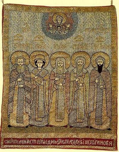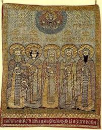 | Keywords: Bishops of Novgorod.jpg овго одские святители асте ская Анны Иоановны Ст огановой шитьё пелена Сольвычегодск се XVII в 38 х 30 5 После 1926 года поступила из Хутынского монасты я ГО З овго од http //drevo-info ru/pictures/3210 html century 17 anonimus Pelena Novgorod Art and History Museum Stroganov workshops Synaxis of saints icons PD-Art |