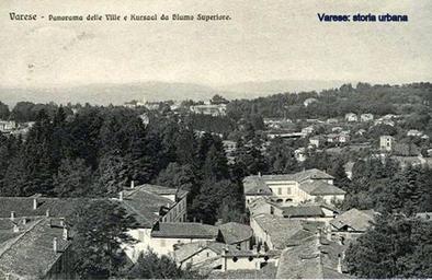 Keywords: Panorama ripreso da Biumo Superiore. In lontananza il colle Campigli con il Kursaal. In primo piano villa Menafoglio (ora Panza) a sinistra e villa Banchieri con la via Ponti a destra. varese biumosuperiore