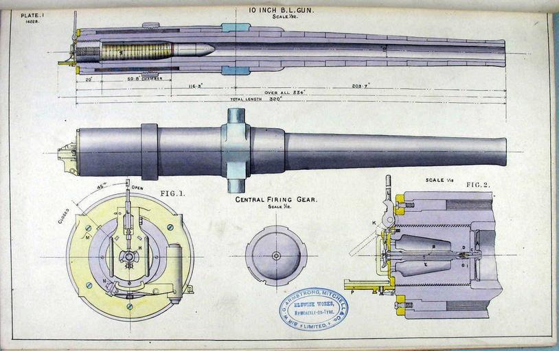 Keywords: BL 10 inch 30 calibre Armstrong gun diagrams.jpg Diagrams showing barrel and breech mechanism of Armstrong 10-inch 30 calibre rifled breechloading naval gun as purchased by Australian colony of Victoria Plate I in Instructions For 10 Inch Rifled Breech Loading Armstrong Gun and Automatic Naval Carriage And Slide <br>Downloaded from National Archives of Australia http //recordsearch naa gov au/scripts/Imagine asp B 4039832 circa 1880 s Armstrong Mitchell Elswick Works PD-Old Gun barrels BL 10 inch Gun breeches BL 10 inch Elswick Ordnance Company Naval guns of the United Kingdom 254 mm artillery |