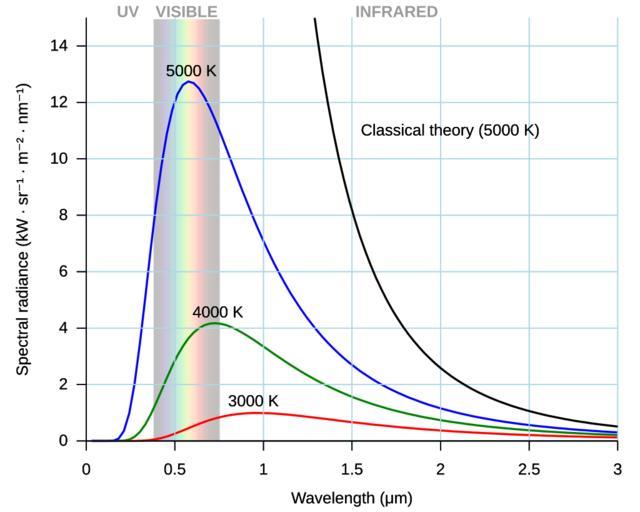 | Keywords: Black body.svg en Black body curves of Planck for various temperatures and comparison with classical theory of Rayleigh-Jeans it Confronto fra le curve del corpo nero della teoria di Planck e della teoria classica di Rayleigh-Jeans own Darth Kule 2010-06-05 <gallery> File Black body mk svg language mk </gallery> translatable Created with Gnuplot gnuplot source <source lang gnuplot > set term svg set termoption enhanced set encoding utf8 set output 'Black_body svg' unset key set tics nomirror out set border 3 set xrange 0 6 set yrange 0 15 set ylabel Spectral radiance kW sr ¹ m ² nm ¹ set xlabel Wavelength μm set label 5000 K at 0 45 13 1 set label 4000 K at 0 6 4 55 set label 3000 K at 0 8 1 4 set label Classical theory 5000 K at 1 55 11 set grid lc rgb light-blue length unit is micrometre c 3e14 speed of light h 6 626e-22 Planck constant k 1 38e-11 Boltzmann constant Planck curves p1 x 1e-6 2 h c 2/ x 5 exp h c/ x k 3000 -1 p2 x 1e-6 2 h c 2/ x 5 exp h c/ x k 4000 -1 p3 x 1e-6 2 h c 2/ x 5 exp h c/ x k 5000 -1 p4 x 1e-6 2 h c 2/ x 5 exp h c/ x k 6000 -1 Rayleigh-Jeans curve rj x 1e-6 2 c k 5000/ x 4 plot p1 x lw 2 p2 x lw 2 p3 x lw 2 p4 x lw 2 plot rj x lw 2 lc rgb black </source> Rayleigh Jeans law Images with Gnuplot source code |