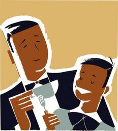 Keywords: black bonding child dad daddy eating family father kid meal son