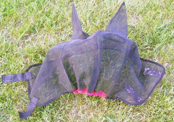 Keywords: Black fly mask.jpg en A fly mask for horses with ear protection own Montanabw 2008-06-24 Fly masks Ear nets Taken with Olympus C-765UZ