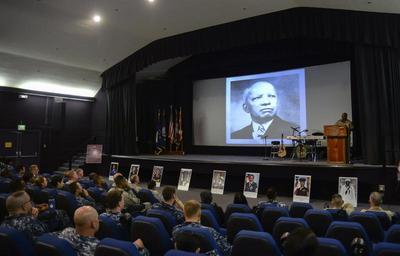 Keywords: Black History Month observance 150226-N-GI544-057.jpg en 150226-N-GI544-057 PEARL HARBOR Feb 26 2015 Capt Stanley Keeve Jr commander of Joint Base Pearl Harbor-Hickam JBPHH speaks to service members during a Black History Month observance at Sharkey Theater JBPHH U S Navy photo by Mass Communication Specialist 2nd Class Laurie Dexter/Released 2015-02-26 Petty Officer 2nd Class Laurie Dexter https //www dvidshub net/image/1790074 150226-N-GI544-057 2015-02-27 12 51 PEARL HARBOR HI US PD-USGov-Military-Navy 2015 in Pearl Harbor Black History Month Images from DoD uploaded by Fæ