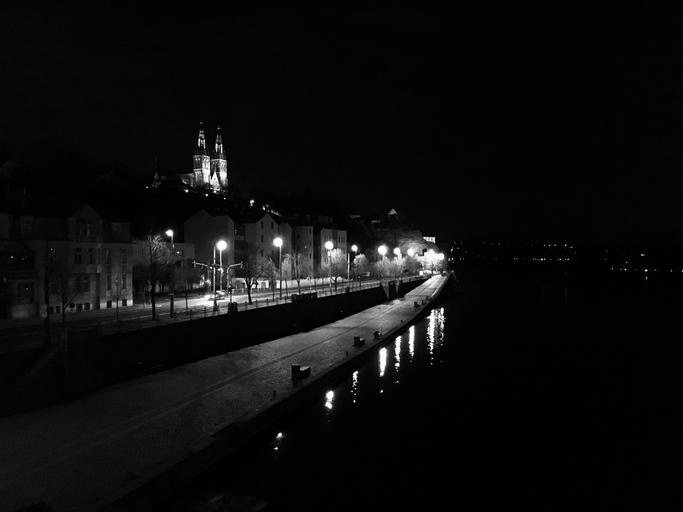 Keywords: black and white cityscape cathedral lights river riverbank prague