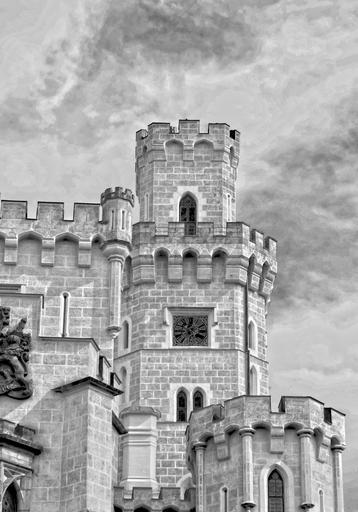 Keywords: black and white tower castle hluboká south bohemia afternoon