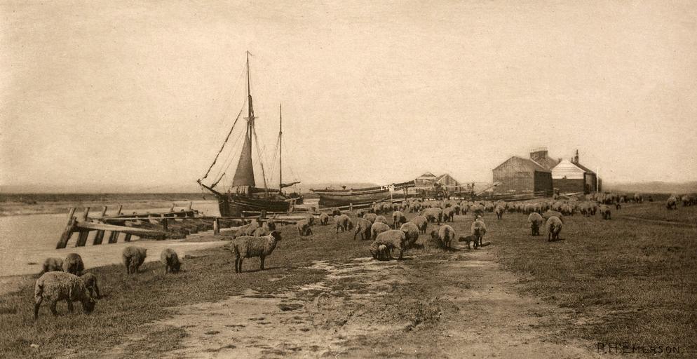 Keywords: Blackshore, River Blythe, Suffolk, Peter Henry Emerson, 1888.jpg Blackshore River Blythe Suffolk by Peter Henry Emerson from his illustrated book 'Pictures of East Anglian Life' In the book Emerson describes this scene as follows <br><br> This is Blackshore on the River Blythe - Blackshore of which we read that once spacious warehouses were erected on its wharf 'for the stowage of nets and other stores one room of which is capable of holding a thousand tons of salt;' that a dock was made there in 1783 and that in the same year twenty fishing-busses met there for the white-herring fishery It seems this quay was made in James the First's reign and must have been the scene of busy life when Dunwich Walberswick and Southwold were flourishing with their fisheries; but as the greater places fell to nothingness so has this little place proportionately fallen into utter decay British Library 1888 Creator Peter Henry Emerson PD-old http //www bl uk/onlinegallery/onlineex/earlyphotos/b/006zzz0tab443a6u00096000 html Peter Henry Emerson 1888 photographs River Blyth Suffolk Sheep in Suffolk |