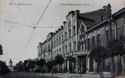| Keywords: Blagoveshchenskaya street, Smolensk 1.jpg en Blagoveshchenskaya street now Big Soviet Street ru Благовещенская улица ныне - Большая Советская улица О игинальная отк ытка е установлены before 1917 года PD-RusEmpire 20th-century postcards of Russia Postcards of Smolensk |
