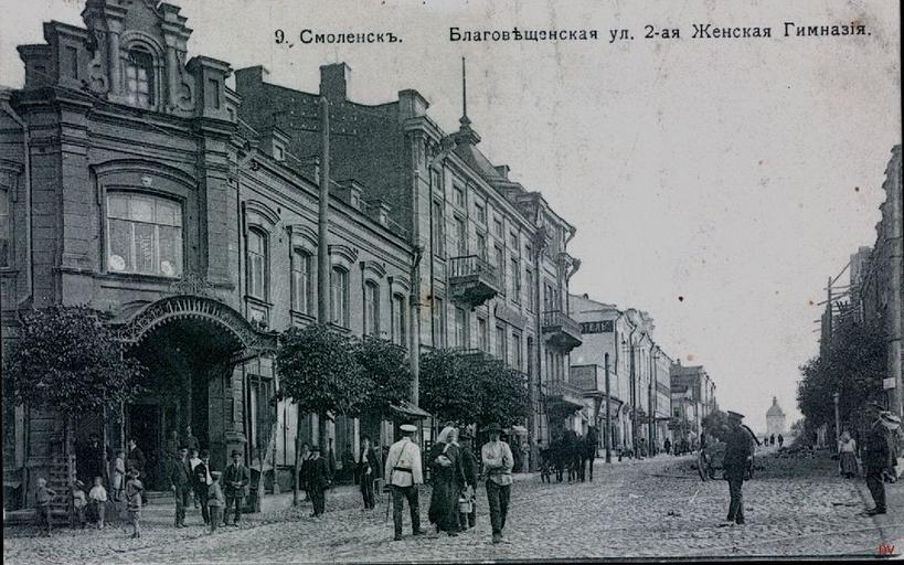 Keywords: Blagoveshchenskaya street, Smolensk 2.jpg en Blagoveshchenskaya Street now Big Soviet Street 2nd women's gymnasium ru Благовещенская улица ныне - Большая Советская улица 2-я женская гимназия О игинальная отк ытка е установлены before 1917 года PD-RusEmpire 20th-century postcards of Russia Postcards of Smolensk