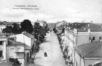 Keywords: Blagoveshchenskaya street, Smolensk 6.jpg en Blagoveshchenskaya street Smolensk ru Благовещенская улица Смоленск О игинальная отк ытка е установлены before 1917 года PD-RusEmpire 20th-century postcards of Russia Postcards of Smolensk