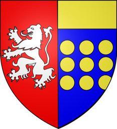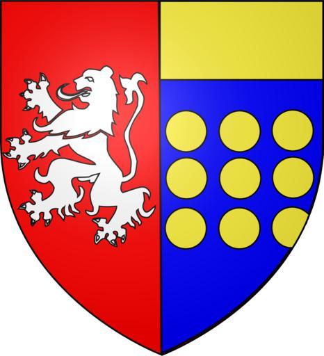 | Keywords: Blason de Bruyères de Melun.svg Parti au premier de gueules au lion d'argent qui est de Bruyères au deuxième d'azur aux neuf besants d'or et au chef du même qui est de Melun own Nicolas C 2009-07-07 Lions rampant argent Coats of arms of the family of Melun |