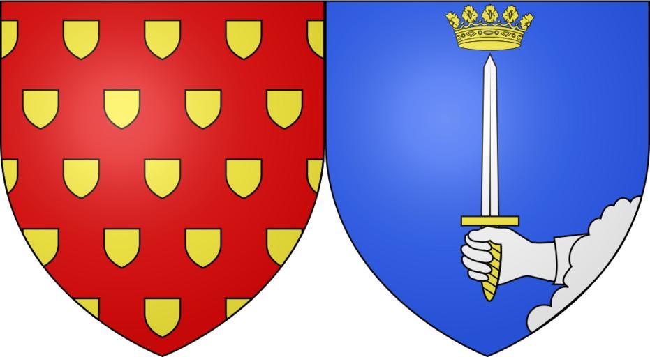 Keywords: Blason de la ville de Cusset (03).svg blazon of en city of Cusset Cusset Allier Cusset Allier fr Deux écus accolés - De gueules semé d'écussons d'or - D'azur au dextrchère d'argent mouvant d'une nuée de même tenant une épée aussi d'argent garnie d'or et couronnée du même it due scudi accollati <br/> - di rosso seminato di scudetti d'oro<br/> - d'azzurro al destrocherio d'argento movente da una nuvola dello stesso tenente una spada pure d'argento guarnita d'oro e coronata dello stesso spax89 Projet Blasons Own spax89 v -Blasons other versions Cusset Two shields coupled in heraldry Semy shields Coats of arms of cities in Allier SVG coats of arms of France DEFAULTSORT Cusset