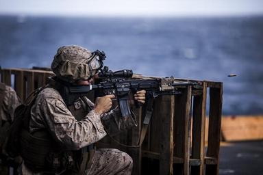 Keywords: Blast Brass (20529203752).jpg A Marine with 15th Marine Expeditionary Unit engages his target during a deck shoot aboard the amphibious assault ship USS Essex The Marines practiced shooting from behind a barricade to simulate staying behind cover during a fire fight U S Marine Corps photo by Cpl Elize McKelvey /Released https //www flickr com/photos/marine_corps/20529203752/ Blast Brass 2015-08-13 08 13 https //www flickr com/people/40927340 N03 Marines from Arlington VA United States PD-USGov United States Marine Corps Official Page https //flickr com/photos/40927340 N03/20529203752 2016-09-03 21 50 57 United States Government Work 15th Marine Expeditionary Unit Shooting United States Marine Corps training M4 carbine USS Essex LHD-2