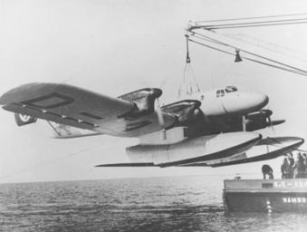 Keywords: Blohm & Voss Ha 139 floatplane being lifted by a crane c1937.jpg A German Blohm Voss Ha 139 floatplane being lifted by a crane of a Blohm Voss crane ship registered in Hamburg Germany Photo https //www history navy mil/our-collections/photography/numerical-list-of-images/nhhc-series/nh-series/NH-112000/NH-112966 html NH 112966 from the U S Navy http //www history navy mil Naval History and Heritage Command ca 1937 author PD-USGov Blohm Voss Ha 139 Deutsche Luft Hansa |