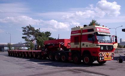 | Keywords: Blokvogn.jpg Mercedes-Benz 5-akslet sættevognstrækker med 11-akslet blokvogn sandsynligvis af mærket Goldhofer venter på starttid for en opgave på Svanemølleværket i København Lasteevne ca 240 tons iflg chauffør 5 axle road tractor with 11 axle trailer probably of the brand Goldhofer awaiting start time for assignment in Copenhagen Denmark According to driver it loads up to 240 metric tons PD by G®iffen Mercedes-Benz SK Heavy haulage tractors Semi-trailer trucks in Denmark | ||||